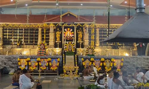 கோவை: ராம்நகர் ஸ்ரீ ஐயப்பன் பூஜா சங்கம் 75-வது ஆண்டு பூஜா மகோத்சவம் நிகழ்ச்சி இன்று புதன்கிழமை 24ம் தேதி காலை 5:30 மணி அளவில் கணபதி ஹோமத்துடன் துவங்கியது. தொடர்ந்து காலை ஏழு முப்பது மணி அளவில் நவகிரக ஹோமம், ஸ்ரீ சுப்பிரமணிய சத்ரு சம்ஹார ஹோமம் ஆகியன நடைபெற்றது. தொடர்ந்து பக்தர்களுக்கு அன்னதானம் வழங்கப்பட்டது.இந்த நிகழ்ச்சியில் வேத பண்டிதர்கள் மற்றும் பொதுமக்கள் ஆகியோர் கலந்து கொண்டனர். முன்னதாக சுவாமி ஐயப்பனுக்கு சிறப்பு பூஜைகள் நடைபெற்றன. பிரம்மாண்டமான அரங்கில் இரண்டு யானை உருவ பொம்மைகளுக்கு நடுவே சபரிமலை ஐயப்பன் பக்தர்களுக்கு காட்சியளித்தார்.