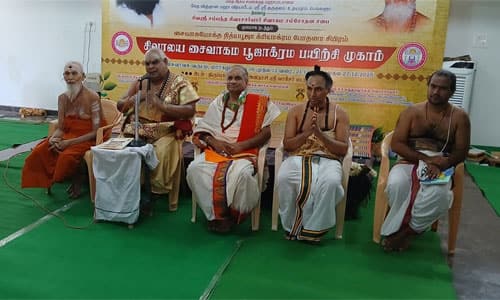 அவிநாசி: அவிநாசி, மங்கலம் ரோட்டில் உள்ள திருப்புக்கொளியூர் அவிநாசி ஸ்ரீ வாகீசர் மடாலயத்தில், ஸ்ரீஸ்ரீ வேத ஆகம ஆய்வு நிறுவனம், சம்பந்த சிவாச்சார்யார் சிவாகம சம்சோதன சபை மற்றும் ஸ்ரீ வாகீசர் மடாலயம் இணைந்து, சிவாலய சைவாகம பூஜாக்ரம பயிற்சி முகாமை நடத்தி வருகின்றன. முகாமின், 3ம் நாளான நேற்று சிவபுராண பாராயணம் நடைபெற்றது. கார்த்திகேய சிவம் வரவேற்றார். பெங்களூரு வேத ஆகம சம்ஸ்க்ருத பாடசாலை முதல்வர் சுந்தரமூர்த்தி சிவாச்சார்யார் ஆசியூரை வழங்கினார். கூனம்பட்டி திருமடம் நடராஜ சிவாச்சார்யார் அனுக்ரஹபாஷனம் வழங்கினார். அவிநாசி லிங்கேஸ்வரர் கோவில் ஆரூர சுப்பிரமணிய சிவம் வாழ்த்துரை வழங்கினார். மதுரை விவேக பட்டரின் சிறப்புரை நடைபெற்றது. இதில், ஆத்மார்த்த நித்ய பூஜை விதியில் உள்ள விஷயங்களை மிக விரிவாகவும், எளிதாகவும் மாணவர்களுக்கு எடுத்துக் கூறப்பட்டது. குளித்தலை சிவஸ்ரீ ஆனந்தசிவம் நித்ய பூஜா அர்ச்சனா விதியை பற்றியும்,அருள்நந்தி சிவம் பஞ்சபர்வங்கள் மற்றும் நடராஜரின் அபிஷேகங்களில் உள்ள விஷயங்கள் குறித்தும் எடுத்துரைத்தனர்.