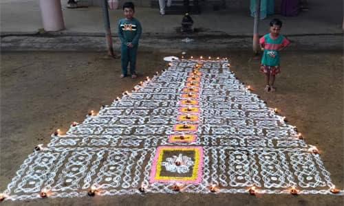 மார்கழி மாத உற்சவத்தையொட்டி நரசிம்மநாயக்கன்பாளையம் சக்தி மாரியம்மன் கோயிலில் தினசரி காலை, 5:00 மணிக்கு சிறப்பு பூஜைகள் நடக்கின்றன. விழாவையொட்டி சக்தி மாரியம்மன், தினசரி சிறப்பு அலங்காரத்தில் எழுந்தருளி, பக்தர்களுக்கு அருள் பாலித்து வருகிறார். கோயிலின் முன்புறம் அதே பகுதியைச் சேர்ந்த பெண்கள் இந்திய நாட்டின் கலை, கலாச்சாரம், பக்தி உணர்வு ஆகியவற்றை வெளிப்படுத்தும் வகையில் தினசரி பிரம்மாண்ட கோலமிட்டு வருகின்றனர். கோயிலின் முன்பு நேற்று காலை மதுரை மீனாட்சி அம்மன் கோவில் கோபுரத்தை நினைவு படுத்தும் வகையில், 15 அடி நீளம், 10 அடி அகலத்தில் தீப அலங்காரத்தில் பெண்கள் கோலமிட்டனர்.