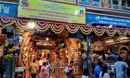 காரைக்கால் திருநள்ளாறு பிரசித்திபெற்ற தர்பாரண்யேஸ்வரர் கோவிலில் கிழக்கு நோக்கி தனி சன்னதியில் சனிஸ்வர பகவான் அனுக்கிரக மூர்த்தியாக பக்தர்களுக்கு அருள்பாலித்து வருகிறார். இக்கோவிலில் வெகுவிமர்ச்சியாகநடைபெறும் சனிப்பெயர்ச்சி விழா நாளை 6ம் தேதி காலை 8.24 மணிக்கு ஸ்ரீசனீஸ்வரபகவான் கும்பராசியிலிருந்து மீனராசிக்கு சனிப்பெயர்ச்சி இடம் பெயர்கிறார்.இதனால் கோவில் நிர்வாகம் பக்தர்களுக்கு பல்வேறு வசதிகள் மேற்கொள்ளப்பட்டுள்ளது. இந்நிலையில் சனிப்பெயர்ச்சியை முன்னிட்டு ஓசூர் பகுதியை சேர்ந்த ரமேஷ் என்பவர் தனது சொந்த செலவில் சுமார் 6டன் பலவகையான மலர்கள், காய்கள்,பழவகைகளை கொண்டு தர்பாரண்யேஸ்வர்,சனிஸ்வரபகவான்,அம்பாள் உள்ளிட்ட அனைத்து சன்னதியில் மலர்கள் மூலம் அலங்கார செய்யப்பட்டுள்ளது.இதனால் சுமார் 150க்கு மேற்பட்ட ஊழியர்களை கொண்டு கடந்த 5ஆண்டுகளாக அலங்கார செய்யப்படுகிறது.மேலும் இதுக்குறித்து ஒசூர் ரமேஷ் கூறுகையில், திருநள்ளார். சபரிமலை. குருவாயூர். மாதேஸ்வர மலை உள்ளிட்ட முக்கிய கோவிலில்களில் முக்கிய விழா காலங்களில் வண்ணமலர்கள் கொண்டு அலங்கார செய்யப்படுவதாக ஒசூர் ரமேஷ் தெரிவித்துள்ளார். சனிப்பெயர்ச்சி விழாவை முன்னிட்டு பக்தர்கள் கவரும் வகையில் பலவகையான மலர்கொண்டு அலங்காரம் செய்யும் பணிகளை பக்தர்கள் ஆர்வத்துடன் கண்டுக்களித்தனர்.