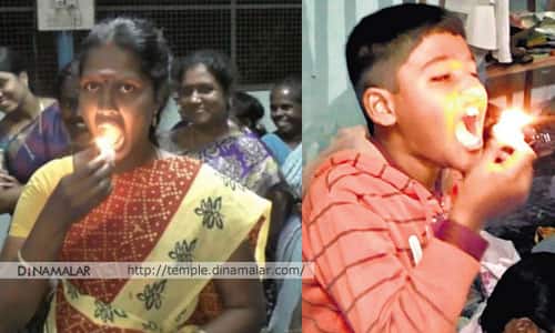 புதுக்கோட்டை: புதுகை அருகே தீயை விழுங்கி பக்தர்கள் விநோத நேர்த்திக்கடன் செலுத்தினர். புதுக்கோட்டை புள்ளான் விடுதியில் உள்ள கற்பக விநாயகர் கோவிலில் நேற்று முன்தினம் இரவு 10:00 மணிக்கு விநாயகர் நோன்பு விழா நடந்தது. இதில் பக்தர்கள் தீயுடன் கூடிய மாவிளக்கை விழுங்கும் விழா நடந்தது. மார்கழி மாதத்தில் சஷ்டி திதியும், சதய நட்சத்திரமும் இணைந்து வரும் நாளில் விநாயகர் நோன்பு விழா கொண்டாடப்படுகிறது. இதில் விநாயகருக்கு உகந்த 21 பதார்த்தங்கள் படையல் இடப்பட்டு தீபாராதனை நடந்தது. பின் பக்தர்கள் தீயுடன் கூடிய மாவிளக்கை பயபக்தியுடன் உண்டு நேர்த்திக்கடன் செலுத்தினர்.