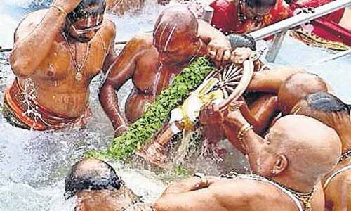 24 மணி நேரம்: மதியம், 2:00 மணிக்கு, திருக்குளத்தில் சக்கரத்தாழ்வாருக்கு தீர்த்தவாரி நடத்தப்பட்டது. அப்போது, லட்சக்கணக்கான பக்தர்கள், திருக்குளத்தில் நீராடினர். தொடர்ந்து இரவு வரை, மொத்தம், ஏழு வாகனங்களில் மலையப்ப சுவாமி மாடவீதியில் வலம் வந்தார். இதைக் காண, மாடவீதியில் உள்ள கேலரிகளில் ஒரு நாள் முழுவதும் பக்தர்கள் காத்திருந்தனர். அவர்களுக்கு, 24 மணி நேரமும் அன்னதானம், குடிநீர், காபி, பால் வழங்கப்பட்டது. ரதசப்தமியை ஒட்டி, திருமலை முழுவதும் அழகிய மலர்களாலும், மின் விளக்குகளாலும் அலங்கரிக்கப்பட்டிருந்தது.