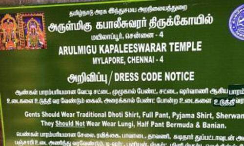 சென்னை : மயிலாப்பூர் கபாலீஸ்வரர் கோவிலில் தரிசிக்க வரும் பக்தர்கள், லெக்கின்ஸ், டி - சர்ட் அணிய தடை விதிக்கப்பட்டுள்ளது.