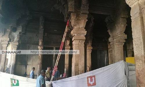 பெரும்பாலும் அம்மா மண்டபத்திலிருந்து ராஜகோபுரம், ரெங்கா ரெங்கா கோபுரங்கள் வழியாகவே பக்தர்கள் ரெங்கநாதரை தரிசித்து வருவார்கள். இங்கு கருட மண்டபத்துக்கும் ஆரியப்பட்டால் வாசலுக்கும் இடைப்பட்ட மண்டபத்தில், கோவில் நிர்வாகம் சார்பில் பிரசாத ஸ்டால் அமைக்கப்பட்டுள்ளது. இங்கு புளியோதரை, பொங்கல், தயிர், சாதம், வடை , லட்டு போன்ற பிரசாதங்கள் விற்பனை செய்யப்படும். இதற்கு அருகில், பக்தர்கள் வசதிக்காக ஏடிஎம் மையங்களும் அமைக்கப்பட்டிருந்தன. அதிகாலையில் ஏற்பட்ட திடீர் தீ விபத்தில் இந்த பிரசாத ஸ்டால் முழுமையாக எரிந்து சேதம் அடைந்துள்ளது. ஏடிஎம் மையங்களுக்கு எந்த சேதமும் ஏற்படவில்லை என்று கூறப்படுகிறது. தீ விபத்து குறித்து தீயணைப்பு நிலையத்திற்கும் தெரிவிக்கப்படவில்லை என்றும் கூறப்படுகிறது. தற்போது தீ விபத்து ஏற்பட்ட பகுதியில் திரை துணியால் மறைப்பு ஏற்படுத்திவிட்டு, பக்தர்களை அனுமதிக்காமல், கோவில் பணியாளர்கள் தீவிபத்து ஏற்பட்ட இடத்தை சுத்தம் செய்து, தண்ணீர் ஊற்றி கழுவி வருகின்றனர். தீ விபத்து ஏற்பட்டு அதன் அடையாளமாக மண்டபம் பகுதியில் கரிப்புகை படிந்துள்ளது. தீ விபத்து ஏற்பட்ட பகுதிக்கு பத்திரிகையாளர்களும் அனுமதிக்கப்படவில்லை.