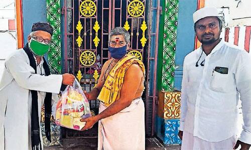 மேலும், திருமணம் உள்ளிட்ட சுப நிகழ்ச்சிகளும் நடத்தப்படாததால், சிறிய கோவில்களின் அர்ச்சகர்கள் மிகுந்த சிரமத்துக்கு உள்ளாகி உள்ளனர்.இந்நிலையில், தஞ்சாவூர், அய்யங்கடை தெரு பள்ளிவாசல் இமாம் ஏற்பாட்டின்படி, ரசாஏ முஸ்தபா அறக்கட்டளை சார்பில், அர்ச்சகர்களுக்கு நிவாரண உதவிகள் வழங்கப்பட்டன. இதன்படி, தஞ்சாவூர் வடக்கு வீதி விநாயகர் கோவில் பகுதியில் உள்ள, 15 கோவில் அர்ச்சகர்களின் குடும்பங்களுக்கு, தலா, 800 ரூபாய் மதிப்புள்ள அரிசி, பருப்பு, சர்க்கரை உள்ளிட்ட அத்தியாவசியப் பொருட்கள் வழங்கப்பட்டன.
