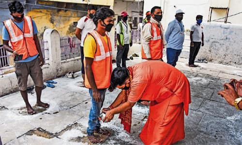 பிரயாக்ராஜ்: உ.பி., பிரயாக்ராஜ் பகுதியில் கொரோனா வைரஸ் தொற்றை தடுக்க, கடந்த ஒரு மாததிற்கு மேலாக தூய்மை பணியாளர்கள் கிருமி நாசினி தெளிப்பு, பிளீச்சிங், சுண்ணாம்பு பவுடர் போடுதல், வடிகால் சுத்தம் செய்தல் போன்ற பணிகளில் தீவிரமாக ஈடுபட்டுள்ளனர். அவர்களுக்கு மரியாதை செலுத்தும் வகையில் கொரோனா வைரஸ் ஒழிப்பில் பணியாற்றும் சுகாதார பணியாளர்களை கவுரவிக்கும் வகையில், கோவில் பூசாரி பாதங்களை கழுவி, மரியாதை செலுத்தினார்.
