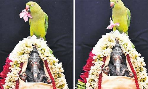 திருப்பூர்: திருப்பூரில் உள்ள ஒரு வீட்டில், விநாயகர் சதுர்த்தி விழாவில், செல்லமாக வளர்க்கும் கிளியும், மலர்துாவி அர்ச்சனை செய்தது, பரவசத்தை ஏற்படுத்தியது.