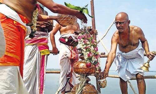 ராமேஸ்வரம்: தனுஷ்கோடி அருகே கோதண்டராமர் கோயில் விமானத்தில் கலசம் பிரதிஷ்டை நடந்தது. ராமாயண வரலாற்றில்,சீதையை விடுவிக்க வலியுறுத்திய விபீஷணரை, தன் தம்பி என பாராமல் ராவணன் அவமானப்படுத்தியதும், அங்கிருந்து வெளியேறி தனுஷ்கோடியில் இருந்த ஸ்ரீ ராமரிடம் அடைக்கலம் தேடி வருகிறார். விபீஷணரை இலங்கை மன்னராக ஸ்ரீராமர் அறிவித்து, கடல்நீரில் விபீஷணருக்கு பட்டாபிேஷகம் சூட்டினார் என கூறப்படுகிறது. இதனை நினைவு கூறும் விதமாக தனுஷ்கோடி அருகே கோதண்டராமர் கோயில் உருவானது. பழமையான இக்கோயில் விமானத்தில் 2019 டிச.,31ல் கலசம் திருடு போனது.நேற்று கோதண்டராமர் கோயிலில் பூரணாஹூதி, யாகசாலை பூஜை நடந்ததும், விமானத்தில் பிரதிஷ்டை செய்த கலசத்திற்கு குருக்கள் புனித நீரை ஊற்றி பூஜை செய்து, தீபாராதனை நடத்தினர். கோயில் இணை ஆணையர் கல்யாணி, உதவி ஆணையர் ஜெயா, உதவி கோட்ட பொறியாளர் மயில்வாகனன், பொறியாளர் ராமமூர்த்தி, ஊழியர்கள் தரிசனம் செய்தனர்.