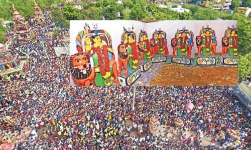 கிராமங்களில் காப்பு கட்டி 15 நாள் விரதம் இருந்த இளைஞர்கள் 50 அடி உயரத்தில் அம்மன் சப்பரம் செய்து, அதைத் தூக்கிக் கொண்டு பக்தர்கள் புடைசூழ அம்மாபட்டிக்கு நேற்று காலை வந்தனர். 6 சுவாமி சிலைகளுக்கு அந்தந்த ஊர் நாட்டாமைகள் அம்மனுக்கு முதல் மரியாதை வழங்கினர். அதன் பின் 6 சப்பரங்களில் சிலைகளை வைத்து அவரவர் ஊர்களுக்கு எடுத்துச் சென்று வழிபட்டனர். ஏழு ஊர்களைச் சேர்ந்தவர்கள் வேலைக்காக எங்கு சென்றிருந்தாலும் இத்திருவிழாவில் பங்கேற்க வந்து விடுவார்கள். ஜாதி பேதமின்றி, அரசியல் பாகுபாடின்றி அனைத்து மக்களும் ஒற்றுமையாக கொண்டாடுவர். திருவிழாவிற்கு ஏற்பாடு செய்து கொடுத்த அமைச்சர் உதயகுமாருக்கு கிராம மக்கள் நன்றி தெரிவித்தனர்.