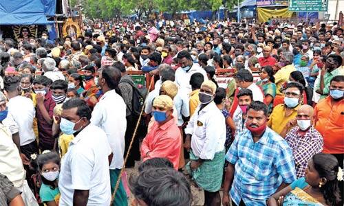 இந்நிலையில் நேற்று பக்தர்கள் காலையில் வழக்கம் போல் சுவாமி தரிசனத்திற்கு வரத் துவங்கினர். இதனால் பக்தர்கள் கூட்டம் மலைக்கோயிலுக்கு அனுமதிக்கும் குடமுழுக்கு அரங்கம் செல்லும் நுழைவாயிலில் அதிகளவில் கூடியது. கோயில் காவலர்கள் போதுமான அளவு இல்லாததால் பக்தர்கள் சமூக இடைவெளியின்றி கிரிவீதியில் நின்றிருந்தனர். கோயில் வாயில் திறக்கப்பட்டதும் பக்தர்கள் உடல் பரிசோதனை செய்யும் இடத்தில் கூடினர். பரிசோதனைக்குப் பின் சுவாரி தரிசனத்திற்கு அனுமதிக்கப்பட்டனர்.