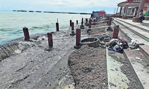 வடகிழக்கு பருவ காற்று வீசும் சீசனில் பாக்ஜலசந்தி கடல் கொந்தளித்து, கடலுக்கு அடியில் வளரும் பாசிகள் பெயர்ந்து கரை ஒதுங்குவது வழங்கும். தற்போது வடகிழக்கு பருவ காற்று தீவிரமடைந்ததால், கடல்பாசிகள் பெயர்ந்து ராமேஸ்வரம் ராமநாதசுவாமி கோயில் அக்னி தீர்த்த கடற்கரையில் தினமும் 2 முதல் 3 டன் ஒதுங்குகிறது.தினமும் நகராட்சி ஊழியர்கள் 5 பேர் தீர்த்த கரையில் ஒதுங்கும் கடல்பாசியை 3 டிராக்டரில் ஏற்றி, சுத்தம் செய்கின்றனர். ஆனால் அடுத்தடுத்து கரை ஒதுங்கும் பாசிகளை விரைவாக அள்ள முடியாமல் ஊழியர்கள் திணறுகின்றனர்.இதனால் அக்னி தீர்த்த கரையில் பாசிகள் குவிந்த சில மணி நேரத்தில், அப்பகுதி முழுவதும் துர்நாற்றம் வீசுவதால் பக்தர்கள் சிரமத்துடன் புனித நீராடி செல்கின்றனர்.