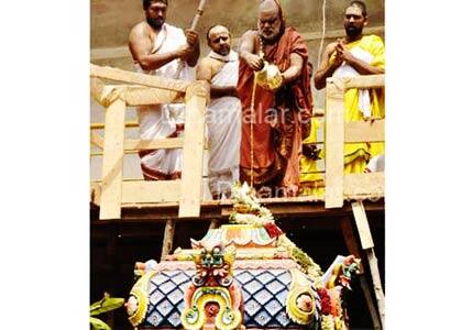 மதுரை: மதுரை அம்மன்சந்நிதி தெருவில் உள்ள சிருங்கேரிமடத்தில் சாரதாம்பாள் கோயில் கும்பாபிஷேகத்தை பாரதீதீர்த்தசுவாமி நடத்தி வைத்தார். நேற்று காலையில் சாரதாம்பாள் கோயிலில் சுவாமி, மூர்த்தி பிரதிஷ்டை செய்து கும்பாபிஷேகத்தை நடத்தி வைத்தார். காசி விஸ்வநாதர், விசாலாட்சி, சாரதாம்பாளுக்கு மகாஅபிஷேகம் செய்யப்பட்டது. விமானங்களில் புனித நீர் ஊற்றி, தீபாராதனை நடந்தது. இன்று காலை 7.30 மணிக்கு, மீனாட்சியம்மன் கோவில் திருக்கல்யாண மண்டபத்தில் சந்திரமவுலீஸ்வர பூஜை நடக்கிறது. 10 மணிக்கு சுவாமி பக்தர்களுக்கு தரிசனம் அளித்து பிரசாதம் வழங்குகிறார். மாலை 4 மணிக்கு தேனி புறப்படுகிறார்.