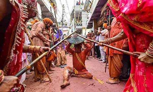 இந்தக் கதையை அடிப்டையாக வைத்து பல நுாறு வருடங்களாக மதுராவில் நடந்துவருவது தான் ‛லாத்மார் ஹோலி பண்டிகை.கோவிட் எச்சரிக்கையையும் தாண்டி ஏாராளமானபேர் இந்த விழாவில் கலந்து கொண்டவனர்.பெண்கள் கோபிகையர் போல வேடமணிந்து கைகளில் தடி ஏந்தி வந்தனர் ஆண்களும் அதே போல புராணத்தில் சொல்லியபடி வேடமணிந்து கைகளில் கேடயம் போல ஒரு தடுப்புடன் வந்தனர்.அப்படி வந்தவர்களை பெண்கள் தடியால் அடி்ததனர் அத்தனை அடிகளையும் ‛தடுப்பில் வாங்கிக் கொண்ட ஆண்கள் பின் பின்வாங்கி ஒடினர். இதன் பின் பெண்கள் கையில் உள்ள தடியை கிழே போட்டுவிட்டு மேலும் வண்ணங்களை எடுத்து தோழியர்கள் மீது பூசியபடி மிகுந்த ஆனந்தத்துடன் பாட்டுப்பாடி நடமாடி மகிழ்ந்தனர்.இந்த நிகழ்வை பல ஆயிரக்கணக்கான பக்தர்கள் பார்த்து மகிழ்ந்தனர். -எல்.முருகராஜ்.