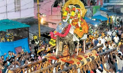திருப்பரங்குன்றம் சுப்பிரமணிய சுவாமி கோயிலில், பங்குனி ஐந்தாம் நாள் திருவிழாவான கைபாரம் நிகழ்ச்சி நடந்தது. கோயிலில் மார்ச் 18ல் திருவிழா துவங்கியது. தினமும் ஒரு வாகனத்தில் சுவாமி அருள்பாலிக்கிறார். நேற்றிரவு 2 டன் எடைகொண்ட வெள்ளி யானை வாகனத்தில் எழுந்தருளிய சுவாமி, தெய்வானையை, சீர்பாதங்கள், கிராமத்தினர், பக்தர்கள் உள்ளங்கைகளில் தலைக்குமேல் துாக்கி கொண்டு கொத்தாள முக்கு முதல் கோயில் வாசல் வரை ஓடினர். பின்பு பக்தர்களுக்கு சந்தனம் வழங்கப்பட்டது. முக்கிய நிகழ்ச்சியாக 29ல் சூரசம்ஹார லீலை, 30ல் சுவாமிக்கு பட்டாபிஷகம், 31ல் திருக்கல்யாணம், ஏப்.,1ல் தேரோட்டம் நடக்கிறது. ஏற்பாடுகளை கோயில் நிர்வாக அதிகாரிகள் செய்து வருகின்றனர்.