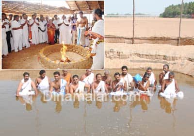 குளம் : இந்த ஹோமத்தை பொதுப்பணித்துறை அமைச்சர் ராமலிங்கம், பள்ளிக்கல்வித்துறை அமைச்சர் சிவபதி ஆகியோர் துவக்கி வைத்தனர். காவிரி ஆற்றின் நடுவே, 25க்கு 25 அடியில் குளம் அமைத்து, 2 அடி ஆழ நீரில் 14 வேத விற்பன்னர்கள் அமர்ந்து வருண பகவானை வேண்டி வேத மந்திரங்கள் முழங்கினர். அருகேயே கொட்டகை அமைத்து மழை வேண்டி மஹா யாகமும் நடக்கிறது. இந்த ஹோமமும், யாகமும் மூன்று நாட்கள் நடக்கின்றன. இதை முன்னிட்டு தலைக்காவிரியிலிருந்து புனித நீர் எடுத்துவரப்பட்டு, ஸ்ரீரங்கம் ரெங்கநாதர், திருவானைக்காவல் அகிலாண்டேஸ்வரி ஜம்புகேஸ்வரர் கோவில்களில் சிறப்பு பூஜை செய்யப்பட்டது.