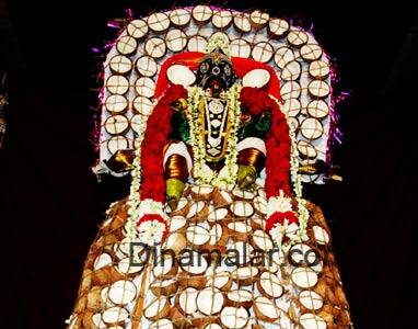 தஞ்சாவூர்: தஞ்சை மூலை அனுமார் கோவிலில் நேற்று நடந்த தேங்காய் துருவல் அபிஷேக பூஜையில் பக்தர்கள் திரளாக பங்கேற்று ஸ்வாமி தரிசனம் செய்தனர். தஞ்சை மேலவீதியிலுள்ள மூலை அனுமார் கோவில் மிகவும் பிரசித்தி பெற்றது. அனுமார் கோவிலில் ஆனி மாத அமாவாசை வழிபாடு நேற்று நடந்தது. இதையொட்டி நேற்றுக்காலையில் லட்ச ராமநாம வழிபாடும், இதைத்தொடர்ந்து 10 மணிக்கு சிறப்பு தேங்காய் துருவல் பூஜை நடந்தது. இதில், தேங்காய் துருவல்களை கொண்டு அபிஷேகம் செய்யப்பட்டது. இத்தகைய சிறப்பு பூஜையில் பக்தர்கள் பங்கேற்றால் வறுமை மற்றும் கடன் தொல்லைகளை மூலை அனுமார் நிவர்த்தி செய்து, அவர்களது துன்பங்களை நீக்குவார் என்பது பக்தர்களின் நம்பிக்கையாகும். அதன் அடிப்படையில் நேற்று நடந்த சிறப்பு பூஜையில் நூற்றுக்கணக்கான பக்தர்கள் பங்கேற்றனர். தொடர்ந்து மாலை ஆறு மணிக்கு 1,008 எலுமிச்சை பழங்கள் மாலை சாற்றி, தீபாராதனை நடந்தது. 18 முறை பக்தர்கள் வலம் வந்து, தங்களது அல்லல்களை போக்க பிரார்த்தனை செய்தனர். ஏற்பாட்டை அமாவாசை வழிபாட்டு குழுவினர் செய்திருந்தனர்.