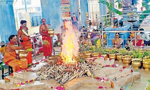 திண்டுக்கல் மலை அடிவாரம் பத்ரகாளியம்மன் கோயிலில் நேற்று ஆவணி மாத அமாவசையை முன்னிட்டு, நோய் தொற்றில் இருந்து மக்களை காக்க யாகம் நடந்தது. துளசி, பிரண்டை, கற்றாழை, ஆடுதொடா, ஓமவள்ளி, கண்டங்கத்தரி, முள்முருங்கை, அரச வேர், மா இலை, வேம்பு, பூலப்பூ உள்ளிட்ட 108 மூலிகைகள், 9 வகை பழங்கள், பூக்கள், நவ தானியம், மிளகாய் வத்தல், வஸ்திரம் மற்றும் நாணயங்கள் கொண்டு யாகம் செய்யப்பட்டது. தொடர்ந்து பத்ரகாளியம்மனுக்கு சிறப்பு அபிஷேக, ஆராதனை செய்யப்பட்டது. திரளான பக்தர்கள் பங்கேற்றனர்.
