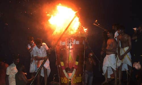 திருவண்ணாமலை அருணாசலேஸ்வரர் கோவிலில் கடந்த, 10ல், தீப திருவிழா கொடியேற்றத்துடன் தொடங்கியது. இன்று அதிகாலை, 2:00 மணிக்கு கோவில் நடை திறக்கப்பட்டு அருணாசலேஸ்வரர், உண்ணாமுலையம்மனுக்கு சிறப்பு அபிேஷகம் செய்யப்பட்டது. சுவாமி கருவறை எதிரில் சுரேந்தர் குருக்கள், ரமேஷ் குருக்கள் உள்ளிட்ட, 10க்கும் மேற்பட்ட சிவாச்சாரியார்கள் வேத மந்திரம் முழங்க, சிறப்பு யாக பூஜை நடந்தது. பின்னர், ‘ஏகன், அனேகன்’ என்ற தத்துவத்தை கூறி, பஞ்ச பூதங்களை குறிக்கும் வகையில் சுவாமிக்கு ஏற்றப்பட்ட கற்பூர தீபத்திலிருந்து, ஒரு மடக்கில் நெய் தீப விளக்கு ஏற்றப்பட்டு அதை கொண்டு, ஐந்து மடக்குகளில் தீபம் ஏற்றப்பட்டு காலை, 4:00 மணிக்கு பரணி தீபம் ஏற்றப்பட்டது. பின்னர் பரணி தீபத்தை, சுரேந்தர் குருக்கள் கையில் ஏந்தியவாறு கோவில் வளாகத்தில் எடுத்து சென்று, விநாயகர் சன்னிதி முதல், பைரவர் சன்னிதி வரை உள்ளிட்ட அனைத்து சன்னிதிகளிலும் பரணி தீபம் ஏற்றப்பட்டது.