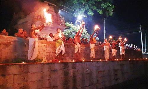கோவில்பட்டி: திருக்கார்த்திகையை முன்னிட்டு, கோவில்பட்டி செண்பகவல்லி அம்மன் கோயில் தெப்பக்குளத்தில் சப்த மகா தீபாராதனை நடந்தது. மேலும், தெப்பக்குளத்தில் 1008 திருவிளக்குகள் ஏற்றப்பட்டது. திருக்கார்த்திகையை முன்னிட்டு, கோவில்பட்டி செண்பகவல்லி அம்மன் கோயில் தெப்பக்குளம் அருகே உள்ள விநாயகர் கோயிலில் சிறப்பு பூஜைகள் நடந்தன. தொடர்ந்து , புண்ணியாகவாசனம் நடந்தது. பின்னர், சப்த நதி நீரை கும்பத்தில் வைத்து கும்ப பூஜை நடந்தது. பின்னர், கும்பத்தை கோயிலில் இருந்து எடுத்து வந்து கோயிலை சுற்றி வலம் வந்தனர். இதையடுத்து, தெப்பத்தில் தீர்த்த அபிஷேகம் மற்றும் புஷ்பம் தூவும் நிகழ்ச்சி நடந்தது. அதைத் தொடர்ந்து, சப்த மகா தீபாராதனை நடந்தது. முன்னதாக, தெப்பக்குளத்தின் சுற்றுச்சுவர்கள், படிக்கட்டுக்கள் என தெப்பக்குளத்தைசுற்றிலும்1008 திருவிளக்குகள் ஏற்றப்பட்டன. ஏற்பாடுகளை இந்து ஆலய பாதுகாப்பு இயக்க மாவட்ட பொதுச்செயலாளர் பரமசிவம் தலைமையில் நிர்வாகிகள் செய்திருந்தனர். நிகழ்ச்சியில், பா.ஜ., வடக்கு மாவட்டத் தலைவர் போத்தீஸ் ராமமூர்த்தி, நகரச் செயலாளர் பாலசுப்பிரமணியன், கட்சி நிர்வாகிகள் பாலு, முனியசாமி, வினோத்குமார் மற்றும் ஏராளமான பக்தர்கள் கலந்து கொண்டனர்.