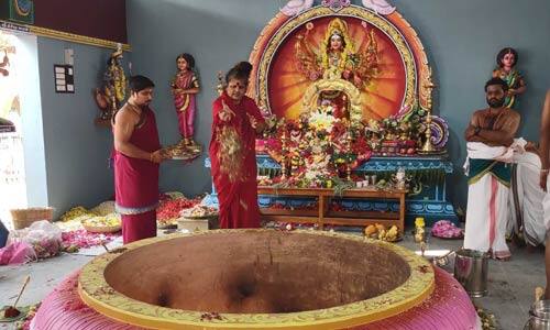 டி.புதுப்பட்டியில் ஆயிரம் கண்ணுடயாள் கோவில் 47 அடி உயர மகாசக்தி மாரியம்மன் சிலை அமைக்கப்பட்டுள்ளது. இங்கு புதிதாக அஷ்ட பைரவர்கள் சூழ்ந்துள்ள மண்டபத்தில் சண்டிகேஸ்வரி சிலை, மகா யாக குண்டம் அமைக்கப்பட்டுள்ளது. இதில் உலக நன்மைக்காகவும், கொரோனா நோய் தொற்றிலிருந்து மக்கள் விடுபடவும் மகா சண்டி ஹோமம் நடத்தப்பட்டது. நேற்று முன்தினம் தொடங்கிய யாகசாலை பூஜையில் நவக்கிரக ஹோமம், விக்னேஸ்வர பூஜை, வாஸ்து சாந்தி போன்றவை செய்யப்பட்டது. நேற்று மகா சண்டி யாகத்தின் ஒரு பகுதி அந்த தம்பதி பூஜை கன்னி பூஜை, சுமங்கலி பூஜை போன்றவை நடத்தப்பட்டு 16 வகை பழங்கள் 108 வகை பூஜை பொருட்களை கொண்டு நடந்து யாகத்தில் பூர்ணாஹூதி செய்யப்பட்டு பக்தர்களுக்கு பிரசாதம், அன்னதானம் வழங்கப்பட்டது.