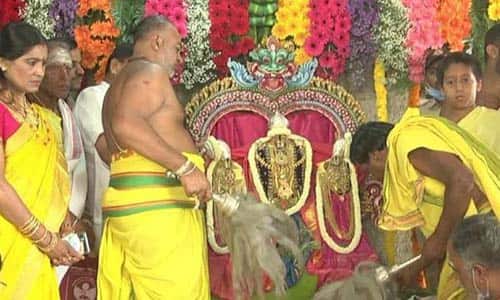 பெங்களூரு: தேவனஹள்ளியில் உள்ள கோட்டே வேணுகோபால சுவாமி கோவில் தருவிழா நடந்தது. 500 ஆண்டு பழமை வாய்ந்த இந்த கோவில் மன்னர் காலத்தில் கட்டப்பட்டது. அரசு கஜானாவிலிருந்து, வெள்ளி கிரீடம், தங்க கிரீடம், ரத்தின கற்கள் கொண்ட வைர தாமரை மாலை, முத்து மாலை உட்பட 21 வகையான மன்னர் காலத்தின் அபூர்வ நகைகள் சுவாமிக்கு அணிவிக்கப்பட்டன. திரளான பக்தர்கள் கண்டுகளித்தனர்.