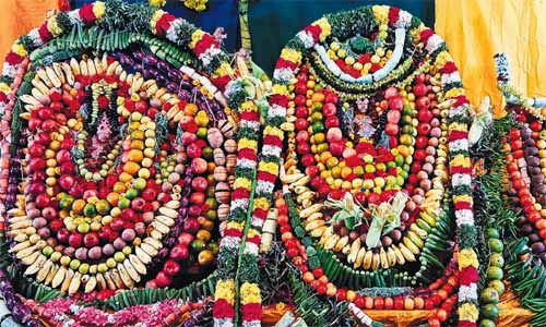விருத்தாசலம் : விருத்தகிரீஸ்வரர் கோவில் மாசிமக விடையாற்றி உற்சவத்தில், காய்கனி அலங்காரத்தில் பஞ்சமூர்த்திகள் அருள்பாலித்தனர்.விருத்தாசலம் விருத்தகிரீஸ்வரர் கோவிலில் மாசிமக பிரம்மோற்சவம் நிறைவு பெற்று, விடையாற்றி உற்சவம் நடந்து வருகிறது. ஆறாம் நாள் உற்சவத்தையொட்டி, நேற்று மாலை ஆழத்து விநாயகர், சுவாமி, அம்பாள், சண்முக சுப்ரமணியர், சண்டிகேஸ்வரர் உள்ளிட்ட பஞ்சமூர்த்திகளுக்கு சிறப்பு அபிேஷக ஆராதனை நடந்தது.இரவு 7:30 மணியளவில், பழங்கள் மற்றும் காய்கறிகள் அடங்கிய காய்கனி அலங்காரத்தில் பஞ்சமூர்த்திகள் அருள்பாலித்தனர். விழாவில், நாத சங்கமம் இசை நிகழ்ச்சி நடந்தது. விருத்தாசலம் குமாரதேவ மட 24வது குருமகா சந்நிதானம் ரத்னவேலாயுத சுவாமிகள் தரிசனம் செய்தார்.