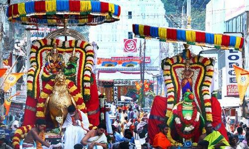 சித்தூர் : காளஹஸ்தி சிவன் கோயில் வருடாந்திர மகா சிவராத்திரி பிரம்மோற்சவத்தின் ஐந்தாம் நாளான இன்று திங்கட்கிழமை காலை காளஹஸ்தீஸ்வரர் அன்ன வாகனத்திலும் ஞானபிரசுனாம்பிகை தாயார் கிளி வாகனத்திலும் நான்கு மாட வீதிகளில் ஊர்வலமாக வந்தனர். கோயில் வளாகத்தில் உள்ள அலங்கார மண்டபத்தில் இருந்து மங்கல வாத்தியங்கள்,மேள தாளங்களுடன் , பண்டரி பஜனைகள் மற்றும் இசைக் குழுவினர் வாகன சேவை நடைபெற்றது. முன்னதாக அலங்கார மண்டபத்தில் உற்சவ மூர்த்திகளுக்கு சிறப்பு அலங்காரம் செய்யப்பட்டதோடு கோயில் அர்ச்சகர்கள் சிறப்பு பூஜைகளும் செய்தனர் . தொடர்ந்து ஊர்வலமாக கொண்டு வந்து வாகனங்களில் அமர்த்தி னர். விநாயகர் , வள்ளி -தெய்வயானை சமேத சுப்ரமணியசுவாமி ,சண்டிகேஸ்வரர் ரத்த கண்ணப்பர் (பஞ்ச மூர்த்திகள்) நான்கு மாட வீதிகளில் ஊர்வலமாக வந்து பக்தர்களுக்கு காட்சியளித்தனர். பக்தர்கள் வழிநெடுகிலும் (4 மாட வீதிகளில்) கற்பூர ஆரத்தியை சமர்ப்பித்து சுவாமி தரிசனம் செய்தனர்.