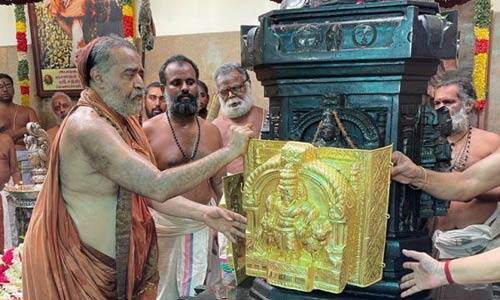 சாஸ்த்ரா பல்கலைக்கழக வேந்தர் சேதுராமன் குடும்பத்தினர் அதிஷ்டானத்தில் பொருத்துவதற்காக தங்க கவசத்தை வழங்கினர். கவசத்தில், மன்னார்குடி ராஜகோபால் சுவாமி, குருவாயூரப்பன், துவாரக கிருஷ்ணன், பாண்டவ துாதப்பெருமாள் ஆகிய சுவாமிகளின் உருவம் பதிக்கப்பட்டுள்ளது. விஜயேந்திர சரஸ்வதி சுவாமிகள் அதிஷ்டானத்தில், கவசத்தை பதித்து, தீபாராதனை செய்தார்.இந்நிகழ்ச்சியை முன்னிட்டு, மடத்தில் மூன்று நாட்களாக வேதபாராயணம், பக்தி இன்னிசை மற்றும் ஹோமங்கள் நடைபெற்றன.