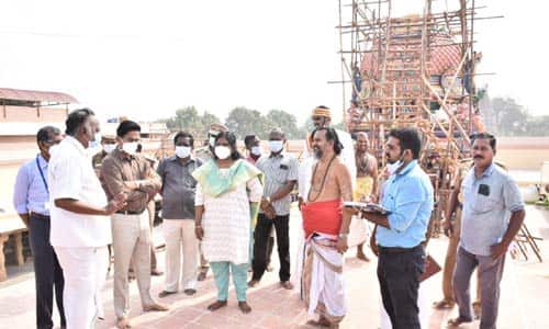 மயிலாடுதுறை : திருக்கடையூர் கோவில் கும்பாபிஷேகம் வரும் 27ஆம் தேதி நடைபெறுவதை முன்னிட்டு முன்னேற்பாடு நடவடிக்கைகளை குறித்து கலெக்டர் லலிதா ஆய்வு மேற்கொண்டார்.