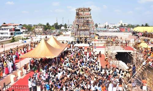 மயிலாடுதுறை: திருக்கடையூர் அபிராமி சமேத அமிர்தகடேஸ்வரர் சுவாமி கோவில் கும்பாபிஷேகம் கோலாகலமாக நடைபெற்றது. ஆயிரக்கணக்கான பக்தர்கள் கலந்து கொண்டு தரிசனம் செய்தனர்.