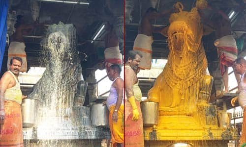 திருவண்ணாமலை அருணாசலேஸ்வரர் கோவிலில், பங்குனி மாத தேய்பிறை பிரதோஷத்தையொட்டி, கோவில் அதிகார நந்தி, கிளி கோபுரம் எதிரிலுள்ள சிறிய நந்தி, ஆயிரங்கால் மண்டபம் அருகிலுள்ள பெரிய நந்தி பெருமானுக்கு பால், பன்னீர், மஞ்சள், சந்தனம்,தேன், இளநீர், எலுமிச்சை, தயிர் உள்ளிட்ட பல்வேறு திரவிய பொருட்களை கொண்டு சிறப்பு அபிஷேகம் செய்யப்பட்டது. தொடர்ந்து, நந்தியம்பெருமானுக்கு சிறப்பு அலங்காரம் செய்யப்பட்டு சிறப்பு பூஜை நடந்தது. இதை ஏராளமான பக்தர்கள் வழிபட்டனர். தொடர்ந்து, உற்சவ மூர்த்திகள் பெரியநாயகர், பெரியநாயகி சுவாமிகள் மூன்றாம் பிரகார வலம் வந்து பக்தர்களுக்கு அருள்பாலித்தனர்.