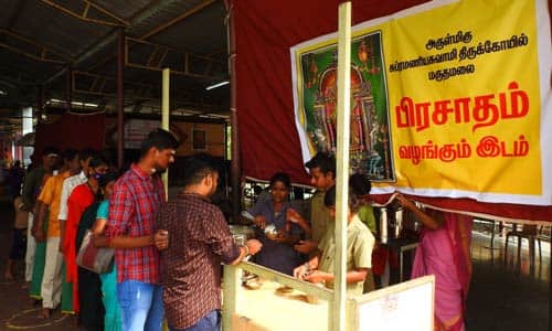 தமிழகத்தில், இந்து சமய அறநிலையத்துறையின் கட்டுப்பாட்டின் கீழ் உள்ள, வடபழனி முருகன் கோவில், மருதமலை சுப்பிரமணியசுவாமி கோவில், திருச்செந்தூர் முருகன் கோவில், ஸ்ரீரங்கம் அரங்கநாதர் கோவில், பழனி, திருவேற்காடு, திருத்தணி உள்ளிட்ட 10 கோவில்களில், நாள்தோறும் பக்தர்களுக்கு பிரசாதம் வழங்கும் திட்ட துவக்க விழா நடந்தது. மருதமலை சுப்பிரமணியசுவாமி கோவிலில் நடந்த நிகழ்ச்சியில், இந்து சமய அறநிலை துறை அமைச்சர் சேகர்பாபு வீடியோ கான்பரன்ஸ் மூலம் கலந்துகொண்டு பிரசாதம் வழங்கும் திட்டத்தை துவக்கி வைத்தார். இந்நிகழ்ச்சியில், அறநிலையத்துறை கோவை மாவட்ட இணை ஆணையர் செந்தில் வேலவன், அறநிலையத்துறை துணை ஆணையர் (பொ) விமலா மற்றும் திருக்கோவில் பணியாளர்கள், பக்தர்கள் கலந்து கொண்டனர்.
