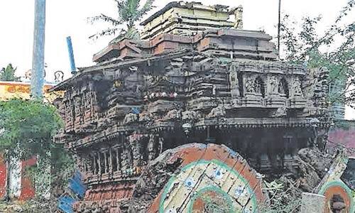 அதை நுட்பமாக உருவாக்கியவர்கள், தங்களுக்கான ஊதியத்திற்காக மட்டும் பணியாற்றி இருந்தால், அவை இத்தனை தெய்வீக உயிர்ப்புடன் இருந்திருக்காது.அதற்கும் மேலாக, தேரை உருவாக்க பணியாற்றியோரின், அதீத தெய்வ பக்தியே, இதுபோன்ற அழகிய ஆன்மிக தேர் உருவாக முக்கிய காரணமாக இருந்திருக்கும்.இந்த தேர் முழுதும் தேக்கு மரத்தாலும், அதன் பிரமாண்டமான இரண்டு சக்கரங்கள் வேங்கை மரத்தாலும் வடிவமைக்கப்பட்டவை. கடந்த, 2009ம் ஆண்டுக்குப் பின், இந்த கோவிலுக்கு புதிய தேர் பயன்பாட்டிற்கு வந்தது. அதுவரை, கோவில் விழாக்களின் பயன்பாட்டில் இருந்த பழைய தேர், அதன் பின் உரிய பராமரிப்பின்றி, சிதிலம்அடைந்தது.கோவில் வளாகத்தின் ஒரு பகுதியில், குப்பையில் வீசப்பட்ட வைரக்கல்லாய் கிடந்து, மழை, வெயிலால் சிதிலமடைந்தது. கோவிலுக்கு வந்து செல்லும் பக்தர்கள், தெய்வீக சிற்பக்கலை வடிவமைப்பில் உருவான, தேரின் நிலை கண்டு ஆதங்கப்பட்டனர். அதை பயன்படுத்த முடியாத நிலை என்றாலும், இயன்றவரை சீரமைத்து, கோவிலின் பழமையான புகழுக்காக காட்சிப்படுத்தலாமே என்கின்றனர். கடந்த மாதம் அதற்கான வீடியோ பதிவு, சமூக வலைதளத்தில் பரவிய பிறகு, கோவில் நிர்வாகத்தினர், அதை பிளாஸ்டிக் ஷீட் வாயிலாக மூடி வைத்துள்ளனர்.இது குறித்து, கோவில் நிர்வாகத்தின் தரப்பில் கூறியதாவது,தேரின் நிலை குறித்து, ஹிந்து சமய அறநிலையத்துறை வாயிலாக, அரசின் கவனத்திற்கு கொண்டு செல்லப்பட்டது.அரசின் பரிசீலனைக்குப் பின், தேர் சீரமைக்கப்பட்டு பக்தர்களின் வேண்டுகோளுக்கு இணங்க, கோவிலின் சிறப்புக்கான ஆன்மிக காட்சிப் பொருளாக பராமரித்து பாதுகாக்கப்படும் என்றார்.