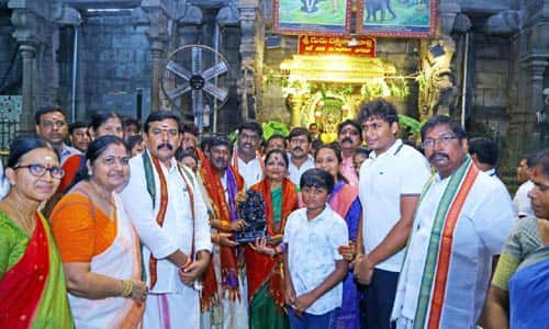 காளஹஸ்தி: திருப்பதி மாவட்டம் ஸ்ரீகாளஹஸ்தி சிவன் கோயிலுக்கு இன்று மத்திய சமூக நீதி துறை இணை அமைச்சர் (Empowerment government of inda) நாராயணசாமி ஸ்ரீ காளஹஸ்தீஸ்வரரை தரிசனம் செய்வதற்காக குடும்பத்தாரோடு கோயிலுக்கு வந்தவரை கோயில் நிர்வாக அதிகாரி சாகர் பாபு மற்றும் கோயில் அறங்காவலர் குழு தலைவர் அஞ்சூரு தாரக.சீனிவாசுலு மற்றும கோயில் அதிகாரிகள் சிறப்பு வரவேற்பு ஏற்பாடு செய்ததோடு கோயிலுக்குள் சென்றவர்கள் ஸ்ரீ காளஹஸ்தீஸ்வரரையும் ஞானபிரசுனாம்பிகை தாயாரையும் சாமி தரிசனம் செய்தவர்களுக்கு கோயில் வளாகத்தில் உள்ள தட்சிணாமூர்த்தி சன்னதி அருகில் பொன்னாடை போர்த்தி கௌரவித்தனர்.மேலும் சாமி படத்தையும் கோயில் தீர்த்தப் பிரசாதங்களை கோயில் சார்பில் வழங்கப்பட்டது.