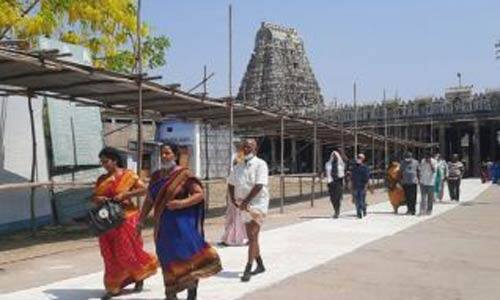 காஞ்சிபுரம்: ஏகாம்பரநாதர் கோவிலில், பக்தர்கள் நடந்து செல்லும் வழியில், வெயிலின் தாக்கத்தை சமாளிக்க கூரை வேயப்பட்டு, தரையில் ரசாயனம் கலந்த கூல் பெயின்ட் பூசப்பட்டு உள்ளது. காஞ்சிபுரம் ஏகாம்பரநாதர் கோவிலுக்கு, பல்வேறு மாநிலங்களில் இருந்து ஏராளமான பக்தர்கள் வருகின்றனர். கோடை வெயில் துவங்கியுள்ள நிலையில், கோவில் வளாக தரையில் சூடு பறக்கிறது.ராஜகோபுரத்தில் இருந்து வெறும் காலில் பக்தர்கள் உள்ளே நடந்து செல்ல முடியாமல் மிகவும் சிரமப்பட்டனர்.