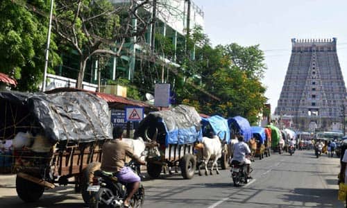 ஸ்ரீரங்கம் ரங்கநாதரை தரிசிக்க மாட்டு வண்டியில் வந்த பக்தர்கள்