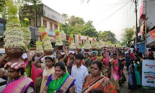 மயிலாடுதுறை : சீர்காழி மந்த கருப்பண்ணசுவாமி கோயிலில் உலக நன்மைக்காக முளைபாலி திருவிழா. 500க்கும் மேற்பட்ட பெண்கள் முளை பாரி எடுத்து சென்று வழிபாடு செய்தனர்.