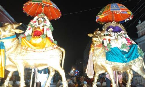 ராமேஸ்வரம் : ராமலிங்க பிரதிஷ்டை விழா யொட்டி நேற்று இரவு ராமேஸ்வரம் ராமநாதசுவாமி கோயில் ரதவீதியில் தங்க ரிஷப வாகனத்தில் ராமநாதசுவாமி, பர்வதவர்த்தினி அம்மன், பிரியாவிடை அம்மன் எழுந்தருளி வீதி உலா வந்தனர்.