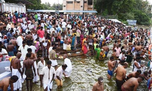 ஆடி அமாவாசையான இன்று நாகை மாவட்டம் பூம்புகாரில், காவிரி கடலோடு கலக்குமிடமான சங்கமத் துறையில் ஆயிரக்கணக்கானோர் தங்களது முதாதையர் நினைவாக தர்பணம் செய்து காவிரி மற்றும் கடலில் புனித நீராடி வழிபட்டனர். சுமங்கலிப்பெண்கள் எலுமிச்சை பழம், தேங்காய், வெற்றிலை, பாக்கு, மஞ்சள் உள்ளிட்ட மங்கலப்பொருட்களை சங்கமத் துறையில் தண்ணிரில் விட்டு வழிபாடு நடத்தினர்.
