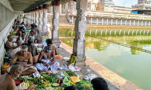 பெற்றோரை இழந்தவர்கள் மற்றும் முன்னோர்களுக்கு ஆடி அமாவாசையன்று தர்ப்பணம் கொடுத்து வழிபடுவது வழக்கம். உலகப் புகழ்பெற்ற சிதம்பரம் நடராஜர் கோவில் வளாகத்தில் உள்ள சிவகங்கை தீர்த்த குளத்தில் இன்று ஆடி மாத அமாவாசையில், முன்னோர்களுக்கு தர்ப்பணம் கொடுத்து வழிபட்டனர். ஆடி அமாவாசையையொட்டி, சிவகங்கை குளக்கரையில் காலை முதல் ஏராளமானோர் அமர்ந்து, தங்கள் மூதாதையர்களுக்கு தர்ப்பணம் கொடுத்தனர். பின்னர் நடராஜர் கோவிலுக்கு சென்று சுவாமி தரிசனம் செய்தனர். புரோகிதர்கள் வரிசையாக அமர்ந்து பொதுமக்களுக்கு தர்ப்பணம் கொடுக்கும் பணியில் ஈடுபட்டனர். தற்போது இந்த ஆண்டு கொரோனா கட்டுப்பாடுகள் தளத்தப்பட்ட நிலையில் கடந்த ஆண்டை விட பல மடங்கு கூடுதலாக பொதுமக்கள் கோவிலில் தர்ப்பணம் கொடுக்க குவிந்தனர்.