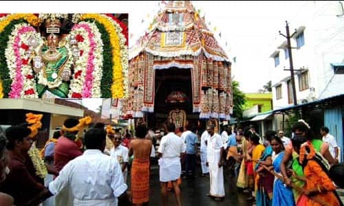 மயிலாடுதுறை மாவட்டம் தரங்கம்பாடி தாலுக்கா திருக்கடையூரில் உலகப் புகழ் பெற்ற தேவாரப்பாடல் பெற்ற ஸ்ரீ அபிராமி சமேத ஸ்ரீ அமிர்தகடேஸ்வரர் கோவில் அமைந்துள்ளது. தருமபுரம் ஆதீனத்திற்கு சொந்தமான இக்கோவிலில் சுவாமி காலசம்ஹார மூர்த்தியாக எழுந்தருளி மார்க்கண்டேயனுக்காக எமனை வதம் செய்ததால் இத்தலம் அட்டவீரட்டத் தலங்களில் ஒன்றாக திகழ்ந்து வருகிறது. அபிராமி அந்தாதி அருளிய அபிராமி பட்டருக்காக ஸ்ரீஅபிராமி அம்மன் அமாவாசையை பௌர்ணமி ஆக்கிய திருவிளையாடல் உள்ளிட்ட பல்வேறு தலபெருமைகளை உடைய இவ்வாலயத்தில் ஸ்ரீஅபிராமி அம்மன் ஆடிப்பூர மகோற்சவம் விழா நடைபெற்று வருகிறது. கடந்த 23ம் தேதி தங்க கொடிமரத்தில் ரிஷபகொடி ஏற்றப்பட்டு 10 நாள் உற்ச்சவத்தின் முக்கிய நிகழ்வாக இன்று தேரோட்டம் நடைபெற்றது. ஸ்ரீ அபிராமி அம்மன் வெள்ளி அலங்காரத்தில் விநாயகர் சண்டிகேஸ்வரருடன் தேரில் எழுந்தருளி மகாதீபாரதனை செய்யப்பட்டது. தொடர்ந்து பக்தர்கள் பக்தி பரவசத்துடன் வடம் பிடித்து இழுக்க தேரோட்டம் நடைபெற்றது. கோயிலை சுற்றி நான்கு ரத வீதிகளில் ஸ்ரீ அபிராமி அம்மன் எழுந்தருளிய தேர் வலம் வந்து நிலையையடைந்தது. வீடுகள் தோறும் தீபாரதனை, அர்ச்சனை செய்து குடியிருப்பு வாசிகள் வழிபாடு செய்தனர்.