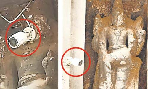 திருவண்ணாமலை, அருணாசலேஸ்வரர் கோவிலில், பக்தர்கள் வருகையை கண்காணிக்க ஒன்பது கோபுரங்கள் மற்றும் கோவில் வளாகம் முழுதும், 50க்கும் மேற்பட்ட கண்காணிப்பு கேமராக்கள் பொருத்தப்பட்டுள்ளன. இந்நிலையில், தெற்கு பக்கத்திலுள்ள திருமஞ்சன கோபுரத்தின் அருகிலுள்ள கட்டை கோபுரத்தில், கோவிலுக்குள் வரும் பக்தர்களை கண்காணிக்க கேமரா பொருத்தப்பட்டுள்ளது. அதற்காக, சிற்பத்தின் முகத்தில், ஆணி வைத்து துளையிட்டு, அதை உடைத்து சேதப்படுத்தி, கேமரா பொருத்தப்பட்டது. மேலும், சிற்பத்தின் உடைந்த முக பாகம் அங்கேயே கிடக்கிறது. இதைக்கண்ட, விஸ்வ ஹிந்து பரிஷத் தொண்டர்கள், சிற்பத்தை சேதப்படுத்தி, கண்காணிப்பு கேமரா பொருத்தப்பட்டதை கண்டித்து குரல் எழுப்பினர். இதையடுத்து, கோவில் நிர்வாகம் அங்கிருந்த கண்காணிப்பு கேமராவை அகற்றி, அதன் அருகில் கோபுரத்தில் துளையிட்டு பொருத்தியுள்ளது. விலை மதிக்க முடியாத கோபுரம் மற்றும் அதிலுள்ள உன்னத சிற்பங்களை சேதப்படுத்தியது, பக்தர்களிடையே அதிர்ச்சியை ஏற்படுத்தி உள்ளது.