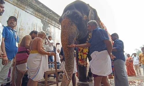 மயிலாடுதுறை : மயிலாடுதுறை மயூரநாதர் ஆலயத்தின் அபயாம்பிகை யானை ஆலயத்திற்கு வருகை தந்து 50 ஆண்டுகள் நிறைவு பெற்றதை முன்னிட்டு சீர்வரிசை எடுத்து வந்து கொண்டாடிய ஊர் மக்கள், காலில் கொலுசு கழுத்தில் டாலர் அலங்கார மணி, அணிந்த யானை, சிறப்பு கலசபிஷேகத்துடன் தீபாராதனை, கரும்பு பொரிகடலை பழங்கள் காய்கறிகள் வெல்லம், குளிர்பானம் வழங்கி பாசத்தை பகிர்ந்து கொண்டு பக்தர்கள் உற்சாகம். தமிழகத்தில் உள்ள அனைத்து கோயில்களுக்கும் யானைகளை வழங்கி தமிழக அரசு பாதுகாக்க வேண்டும் என்று விழாவில் பங்கேற்ற திருவாவடுதுறை ஆதீனம் கோரிக்கை விடுத்தார்.