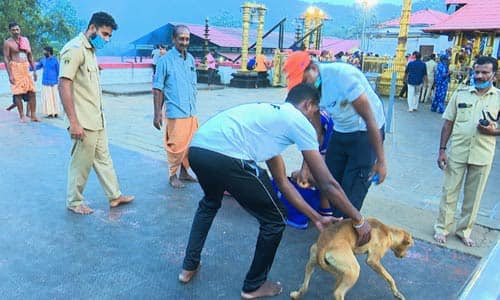சபரிமலை: சபரிமலை திருமுற்றத்தில் வந்த நாயால் பரபரப்பு ஏற்பட்டது. நேற்று மாலை 6:15 மணி அளவில் சன்னிதானம் திருமுற்றத்தில் ஒரு நாய் திடீர் என்று வந்தது. பக்தர் கூட்டத்தில் புகுந்த நாய் ஸ்ரீ கோயில் அருகே செல்ல முயன்றது. ஊழியர்கள் கொடுத்த பிஸ்கட்டுக்கு அடிபணியாமல் பக்தர்களுக்கு இடையே ஓடியது. இதை தொடர்ந்து தேசிய பேரழிவு தடுப்பு நிவாரண படையினர் நடத்திய நீண்ட முயற்சிக்கு பின்னர் நாயை பிடித்து வடக்கு வாசல் வழியாக வெளியே கொண்டு வந்தனர். நாய் ஏதாவது பகதர்களுடன் வந்திருக்க கூடும் என்று போலீசார் தெரிவித்தனர்.