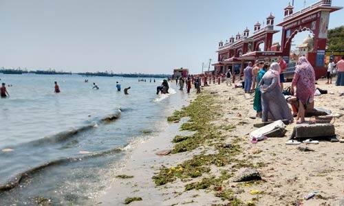 ராமேஸ்வரம் அக்னி தீர்த்த கரையில் பாசிகள் : பக்தர்கள் அருவெருப்பு