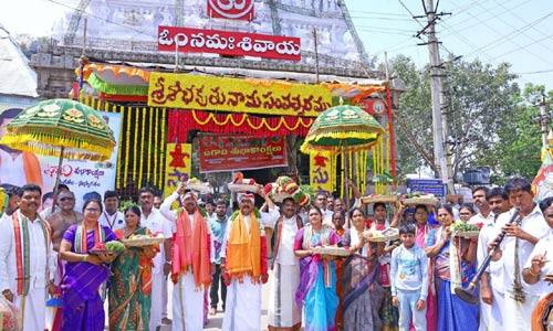 தவனத்தால் அலங்கரிக்கப்பட்ட சப்பரங்களில் உற்சவ மூர்த்திகள் எழுந்தருளி சிறப்பு பூஜைகள் நடத்தப்பட்டன. தேவஸ்தானம் தயாரித்துள்ள தெலுங்கு புத்தாண்டின் புதிய பஞ்சாங்கத்தை எம்எல்ஏ மதுசூதன் ரெட்டி மற்றும் தேவஸ்தான அறங்காவலர் குழு தலைவர் அஞ்சுரு சீனிவாசுலு ஆகியோர் வெளியிட்டனர். மேலும் தேவஸ்தானம் சார்பில், உகாதி பண்டிகையை முன்னிட்டு, தேர் வீதியில் வீற்றிருக்கும் பக்த கண்ணப்ப சுவாமிக்கு, பட்டு வஸ்திரங்கள் வழங்கும் நிகழ்ச்சி நடைப்பெற்றது. எம்எல்ஏ மதுசூதன் ரெட்டி, தேவஸ்தான அறங்காவலர் குழு தலைவர் அஞ்சுரு தாரக சீனிவாசலு ஆகியோர் தலைமையில் அறங்காவலர் குழு உறுப்பினர்கள் கோயிலில் இருந்து பட்டு வஸ்திரங்களையும் பூஜைப் பொருட்களையும் ஊர்வலமாக தலை மீது சசுமந்தபடி எடுத்து வந்து ஸ்ரீ பக்த கண்ணப்ப சுவாமிக்கு ஊர்வலமாக சமர்ப்பித்தனர்.