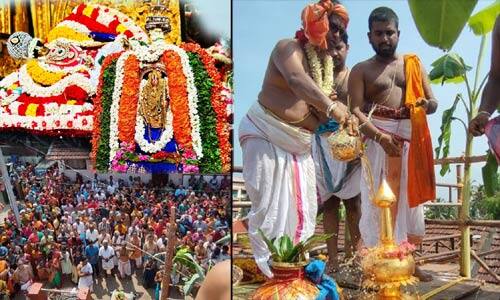 தொடர்ந்து நித்திய பூஜை, யாகசாலை புண்ணியாகம், பஞ்சாக்னி ஹோமம், அந்த ஹோமம், பூர்ணாஹுதி, அக்னிகும்பமாரோகனும், யாத்ராதானம், முகூர்த்ததானம், கோதானம், வேதபாராயணம் சமாப்தி, தீபாராதனை, விமான அபிஷேகம் ஆகியவை நடைபெற்றன. காலை 10 மணி அளவில் மூலவருக்கும் உப தேவர்களுக்கும் மகா கும்பாபிஷேகம் நடைபெற்றது. ஆகாய கலசத்தில் திருத்தீர்த்தம் ஊற்றும் வைபவம் காண ஏராளமான பக்தர்கள் திரண்டு வந்திருந்தனர். தொடர்ந்து தசதரிசனம், மகாநிவேதியம், மகா தீபாராதனை, மகத் ஆசீர்வாதம் ஆகியவை நடைபெற்றது. மாலை 5 மணிக்கு மூன்று யானைகளின் அணிவகுப்புடன் பஞ்சவாத்தியம் முழங்க காழ்ச்சீவேலி நடைபெற்றது. 7 மணிக்கு தீபாராதனை நடந்தது. தொடர்ந்து மேளதாளத்துடன் அஸ்வவாகனத்தில் உற்சவர் திருவீதிகளில் எழுந்தருளி பக்தர்களுக்கு அருள் பாலித்தனர். ஏராளமான பக்தர்கள் தரிசனம் செய்தனர்.