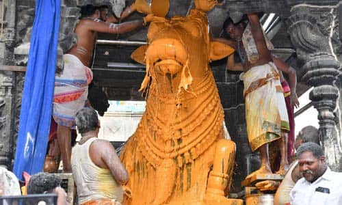 திருவண்ணாமலை, அருணாசலேஸ்வரர் கோவிலில், சனி மஹா பிரதோஷ பூஜை நடந்தது. கோவில் கொடிமரத்தின் அருகிகே உள்ள அதிகார நந்தி, கிளி கோபுரம் எதிரிலுள்ள சிறிய நந்தி, ஆயிரங்கால் மண்டபம் அருகிலுள்ள பெரிய நந்தி, ஆகியவற்றிற்கு பால், பன்னீர், மஞ்சள், சந்தனம், தேன், இளநீர் உள்ளிட்ட பல்வேறு பொருட்கள் கொண்டு சிறப்பு அபிஷேகம் நடந்தது. தொடர்ந்து, நந்தியம் பெருமானுக்கு சிறப்பு அலங்காரம் செய்யப்பட்டு நடந்த பூஜையை, ஏராளமான பக்தர்கள் வழிபட்டனர். பக்தர்கள் ராஜகோபுரம் முன் நீண்ட வரிசையில் காத்திருந்த சுவாமி தரிசனம் செய்தனர்.