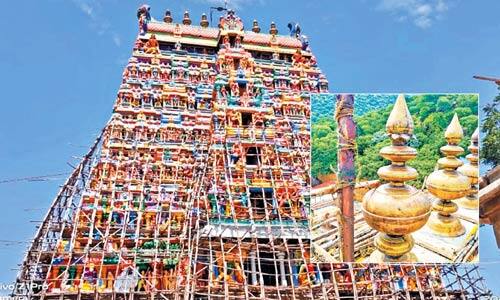 கோயில் துணைகமிஷனர் ராமசாமி கூறியதாவது: 2011ல் கும்பாபிஷேகம் நடந்தது. இவ்வாண்டு நடக்கவுள்ள கும்பாபிஷேகத்திற்கான பணிகள் இரு மாதங்களில் முடிந்து விடும். இக்கோபுரம் ஏழு படி நிலைகளுடன் 120 அடி உயரம் கொண்டது. கோபுரத்தின் மேல் பகுதியில் ஏழு கலசங்கள் உள்ளன. இவை ஒவ்வொன்றும் ஆறேகால் அடி உயரம் கொண்டவை. இதன் ஏழாம் படிநிலையில், கோபுரத்தைக் குடை போல் காக்க கொடுங்கை அமைப்பு உள்ளது. மரத்தாலான இந்த கொடுங்கை சுண்ணாம்பு கலவை கொண்டு பூசப்பட்டுள்ளது. ராஜகோபுரத்தின் மேல் எந்த திசையிலிருந்து மழை பெய்தாலும் மழைநீர் விழாமல் இது பாதுகாக்கிறது. தற்போது பழமை மாறாமல் பொள்ளாச்சி சுண்ணாம்பு, கடுக்காய் உள்ளிட்ட கலவைகள் கொண்டு சிமென்ட் இல்லாமல் புனரமைத்து வருகிறோம், என்றார்.