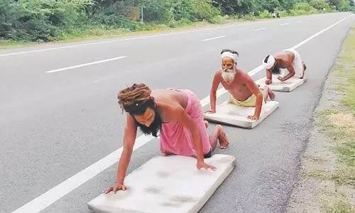 வந்தவாசி: உலக நன்மைக்காக சாலையில் ஊர்ந்தபடி, ராமேஸ்வரத்துக்கு யாத்திரை செல்லும் மூவர், வந்தவாசி வந்தனர். மத்திய பிரதேச மாநிலம் கங்காப்பூரில், கோலோ கோதாம் ஆசிரமம் உள்ளது. இந்த ஆசிரமத்தை சேர்ந்த மூன்று சீடர்கள், உலக நன்மைக்காக சாலையில் ஊர்ந்தபடி, ராமேஸ்வரம் வரை யாத்திரை செல்ல முடிவு செய்தனர். கடந்த ஆண்டு ஜூன், 29-ம் தேதி தொடங்கினர். தெர்மாகோல் அட்டை மீது படுத்து ஊர்ந்தபடி ராமேஸ்வரம் நோக்கி புறப்பட்டனர். திருவண்ணாமலை மாவட்டம் வந்தவாசி தேசிய நெடுஞ்சாலையில் சாலையில், நேற்று ஊர்ந்தபடி சென்றனர். இதைக் கண்ட மக்கள் ஆச்சர்யத்துடன் பார்த்தனர். ‘ம.பி.,யில் இருந்து ராமேஸ்வரம் வரை, 4,000 கி.மீ., துாரத்தை, தெர்மாகோல் அட்டையில் படுத்து ஊர்ந்தபடி நமஸ்காரம் செய்தபடி செல்கிறோம். தினமும், 10 கி.மீ., வரை பயணிக்கிறோம்’ என்றும் தெரிவித்தனர்.